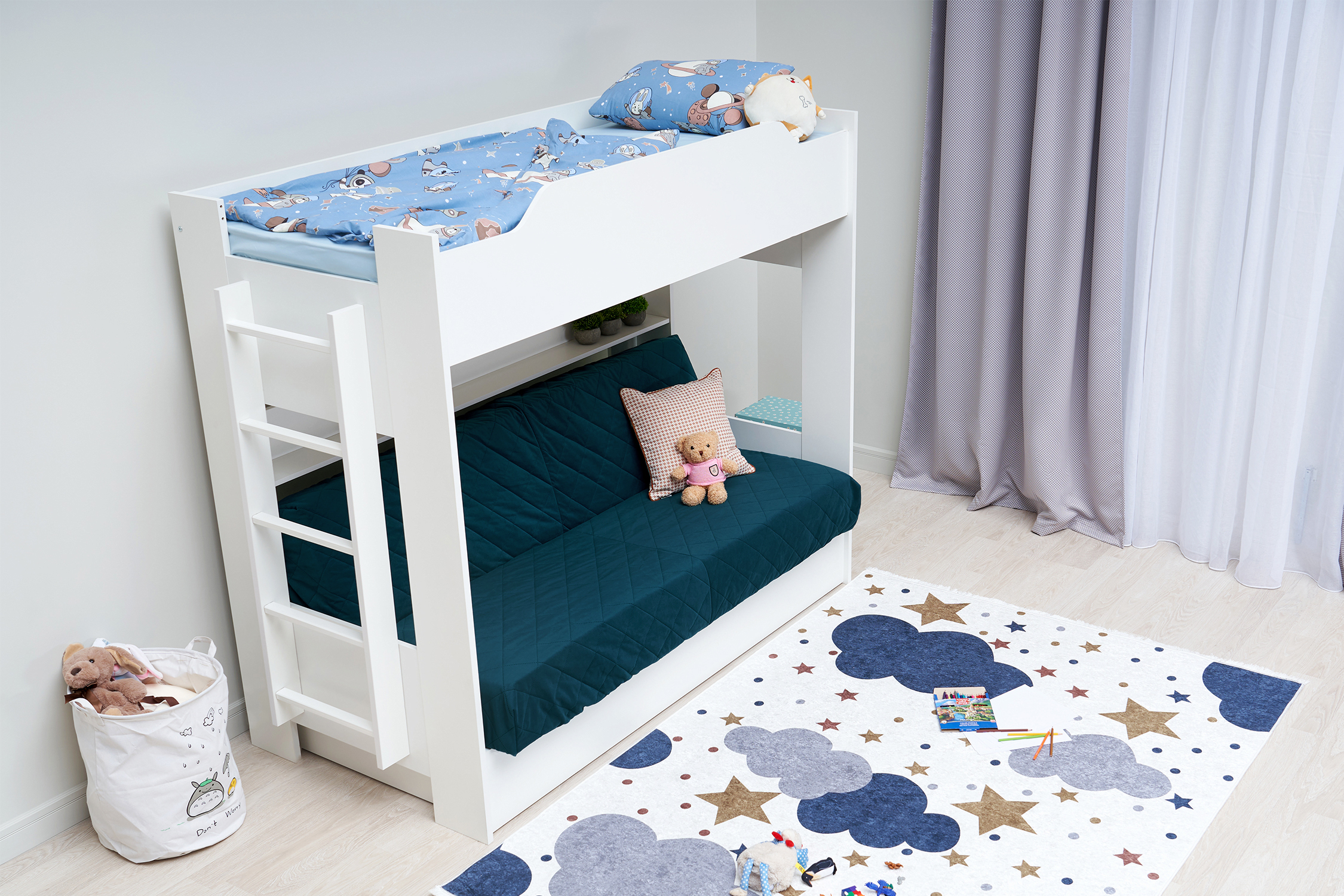 Механизм трансформации дивана: «Книжка». Рекомендуемая высота матраса на верхний ярус 17 см. Максимальная нагрузка на верхний ярус 50 кг. Лестница может быть установлена с обеих сторон кровати. Высота бортика 30 см. Максимальная нагрузка на нижний ярус 90 кг. Чехол съемный.